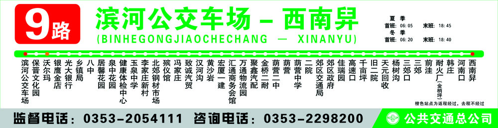 濱河公交車場 - 保晉文化園 - 銀鷹金店 – 光大銀行 - 鄉(xiāng)鎮(zhèn)局 - 八中 - 居馨花園 – 泉 中花園 - 健康體檢中心 - 玉泉中學 - 李家莊新村 - 北郊鋼材市場 – 殯儀館 - 馮家莊 – 致誠汽貿 - 漢河溝 - 黃沙巖 - 匯通商務會館 - 萬通物流園 - 聚鑫汽配 - 金橋二耐 - 蔭營二中 - 蔭營 - 蔭營中學 - 二院 - 郊區(qū)交通運輸局 - 郊區(qū)政府 - 佳瑞園 - 高速口 - 千畝坪 - 舊二院 - 天元回 收 - 楊樹溝 - 三郊口 - 新世紀 - 三郊 - 前洼 - 耐火廠(金梢坪)- 韓莊 - 河南口 - 西南 舁 - 五里莊 - 雨下溝
